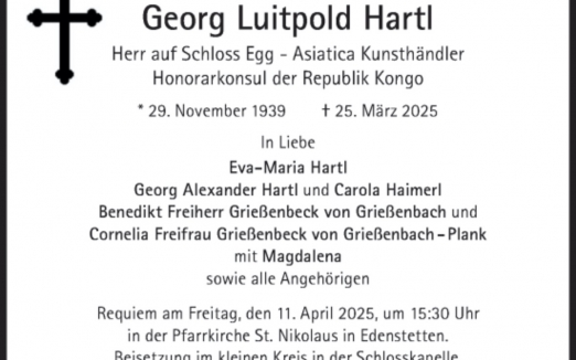 Das Konsularkorps Bayern trauert um sein langjähriges Mitglied Georg Luitpold Hartl, Honorarkonsul der Republik Kongo und Herr von Schloß Egg,...